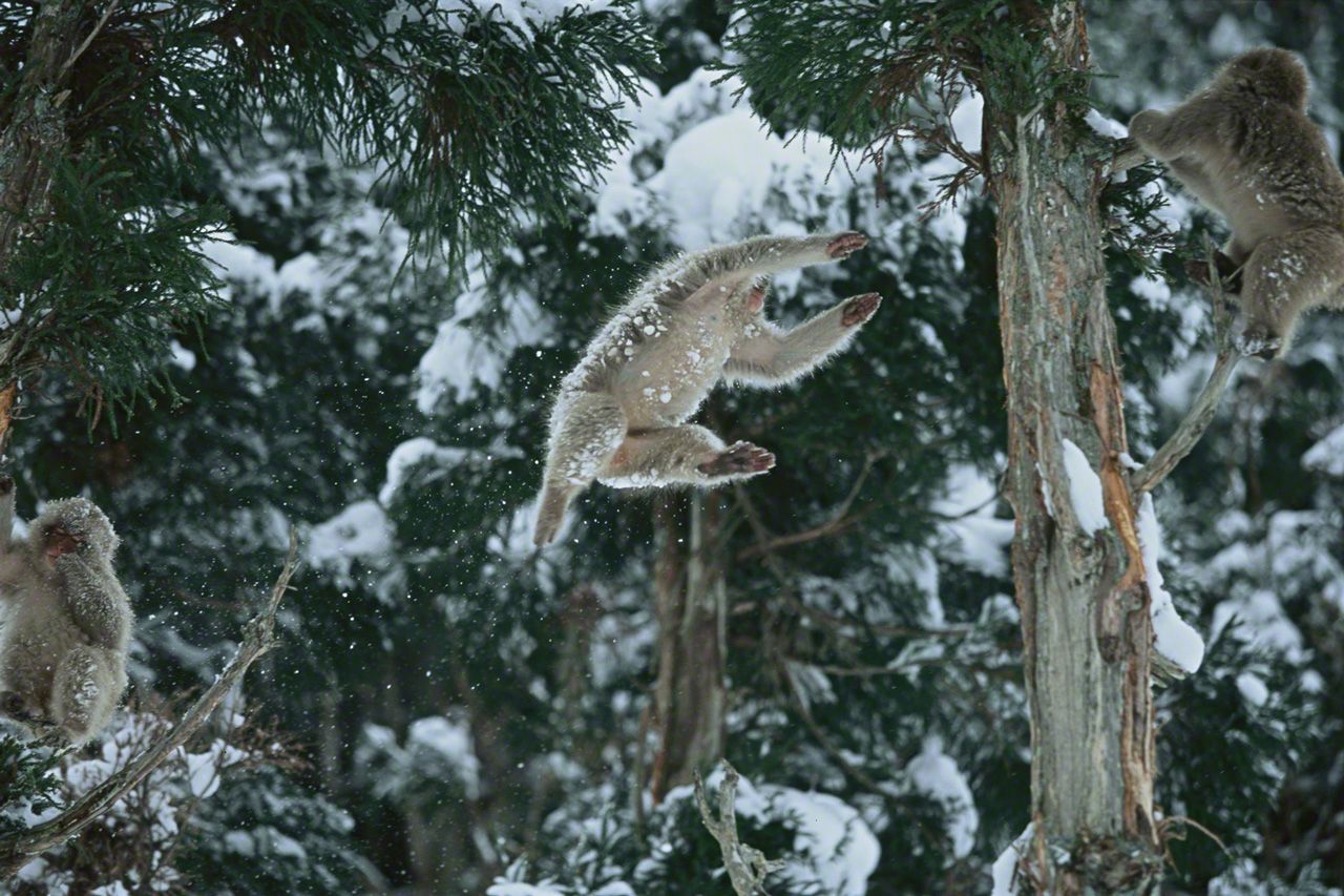 每天清晨,猴子們都下山到公苑來吃「飯」、泡溫泉。由於降雪,河面變窄,有些大猴子就直接跳躍過河 2月
