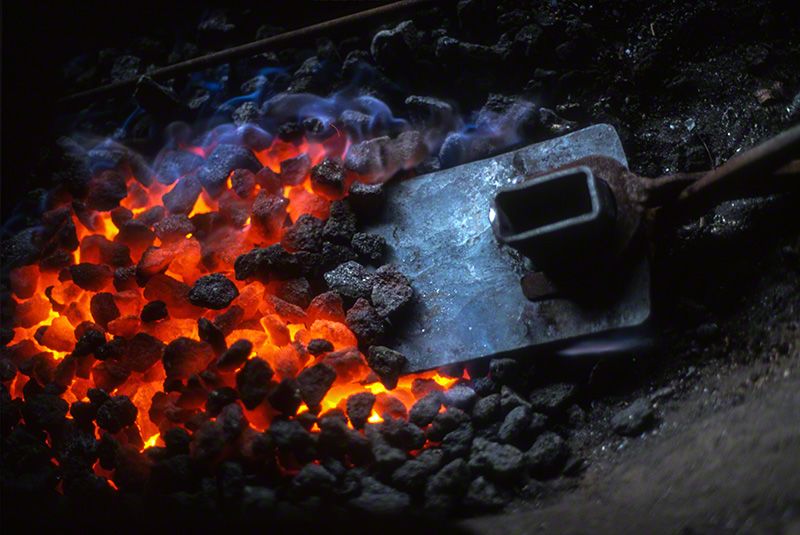 燒得通紅的焦炭中的平鏟。攝於神奈川縣小田原市的鐵匠師傅保阪平藏的作坊
