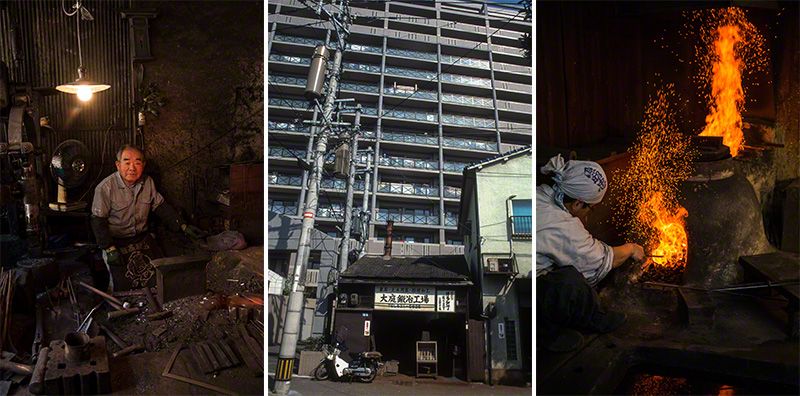 靜岡縣濱松市的片桐鐵鋪/福岡縣福岡市的大庭鍛造工廠。像這樣位於大城市裏的野鐵匠鋪非常少見/對菜刀實施淬火處理前的煆燒作業。攝於大阪府堺市水野鍛造廠的作坊