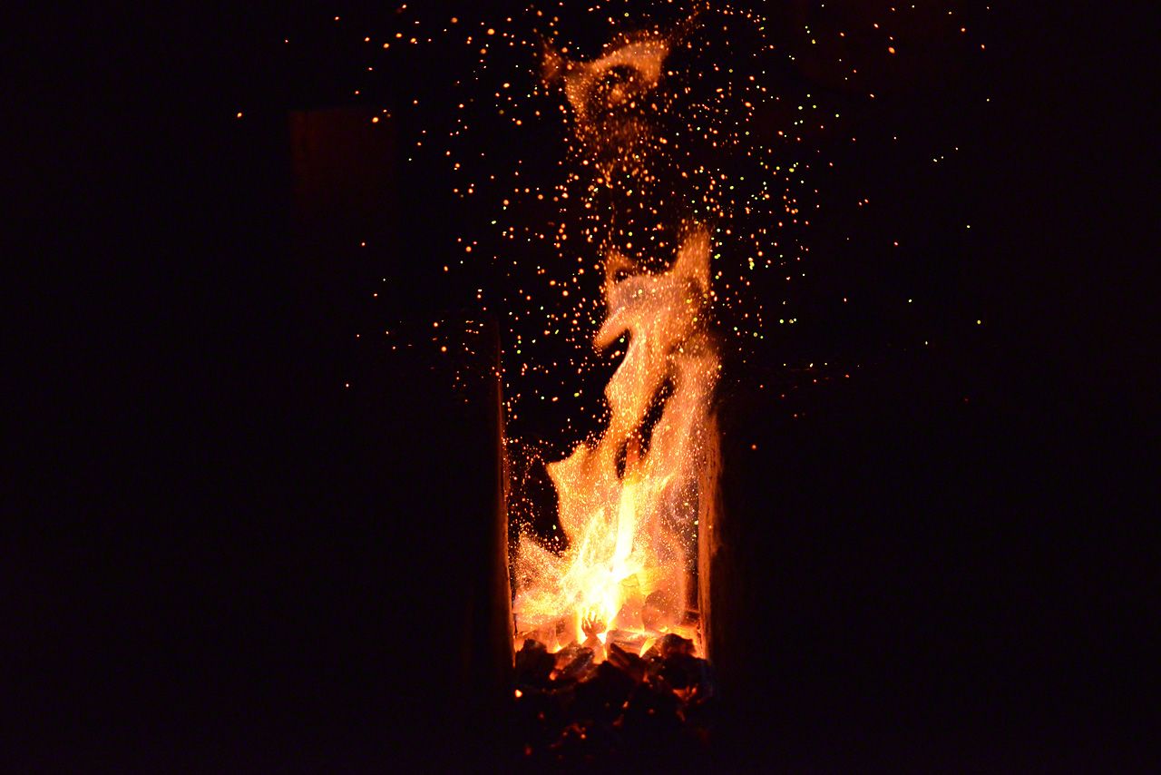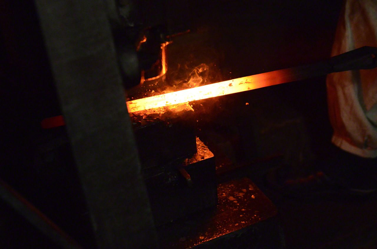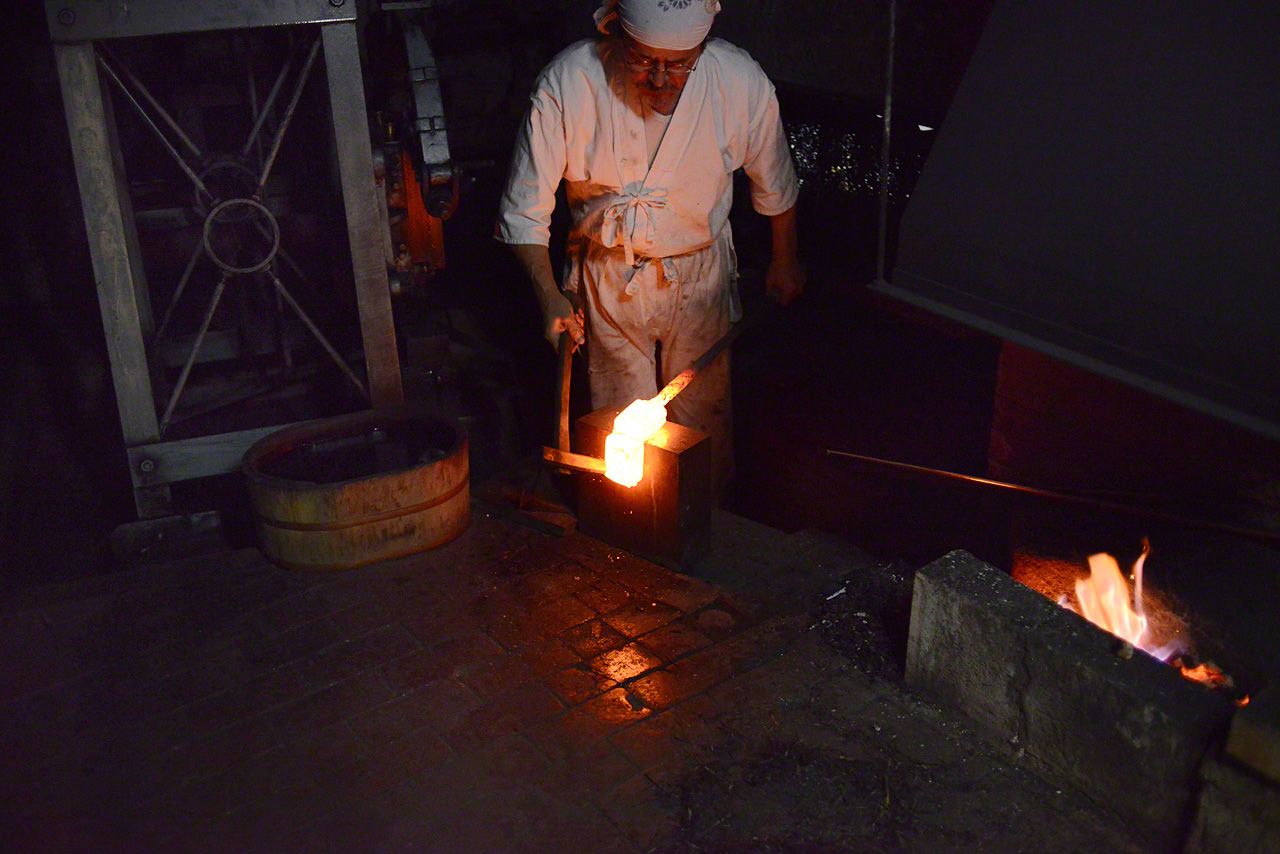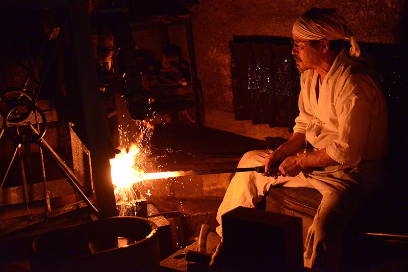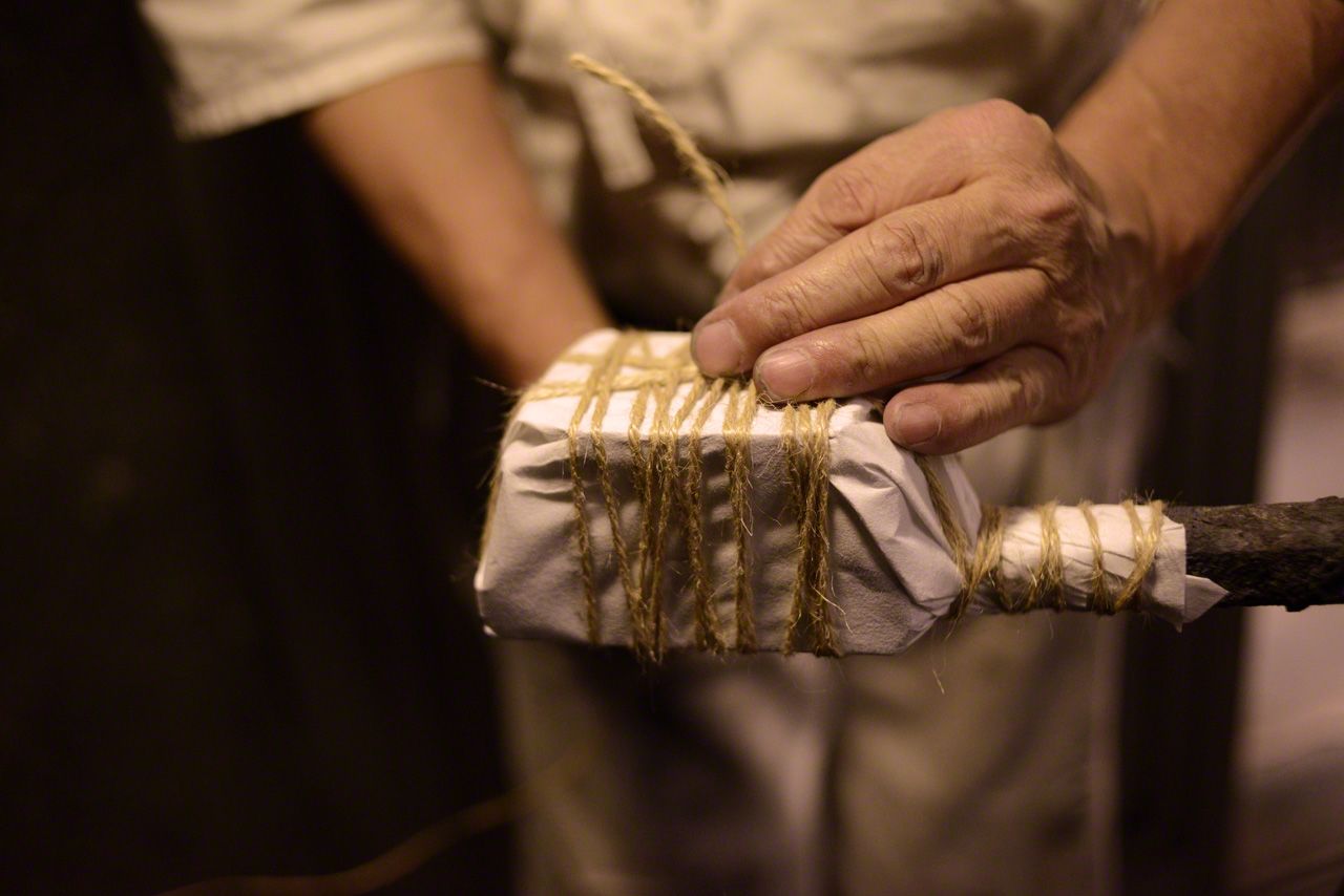 用和紙把鋼鐵包裹起來,再用麻繩捆上,抹上草灰和黏土,放進爐火中燒熔