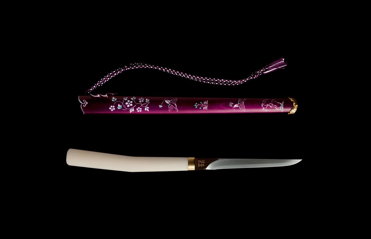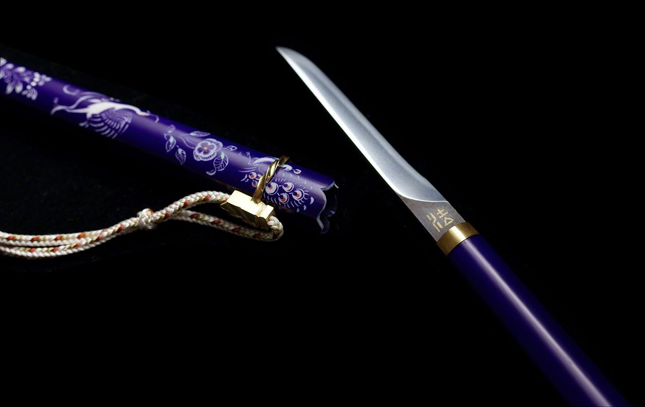 除了鍛造霸氣雄渾的日本刀,宮入也是精緻「刀子」的創作大師。優雅的刀子是天平時代的貴族愛用的文具、首飾衣飾和護身符,也是正倉院珍貴的傳世文化遺產。除了鍛造鋒利的刀身,在染色的象牙上雕刻紋飾和鍍金等精緻的工藝技術,宮入也同樣拿手。