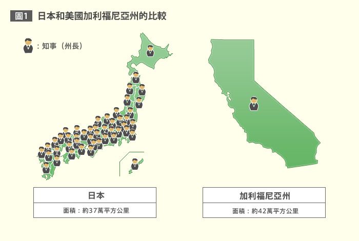 在此,值得注目的是各地引進高度自由的道州制。可以設想把日本分為10個左右的行政單位,各自治體確立近乎於一個國家般的自由度,日本則作為其聯合體。希望大家充分認識到,日本的面積比美國的加利福尼亞州還小這一事實。日本約為37萬平方公里,而加利福尼亞則有42萬平方公里。加利福尼亞州只有1名州長(相當於日本的知事),而日本卻有47位都道府縣的知事。雖然日本在經濟規模和人口數量上約4倍於加州,但不需要47倍之多的知事。造成這一現狀的,是1871年(明治4年)斷然實行的廢藩置縣。