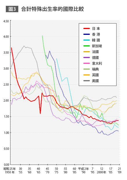 日本出生率降低和人口老齡化趨勢不斷加劇,其嚴峻程度隨處可見。特別是在這次受災嚴重的東北地區,人口老齡化尤顯突出,受到災害打擊最大的也是老年人。但是,嚴峻的出生率降低和人口老齡化問題並不局限於日本。全世界從2005年到2010年間的合計特殊出生率(每位婦女一生中生育的子女數),在OECD(經濟發展與合作組織)加盟國中,繼韓國(1.22)之後,日本與波蘭(同為1.27)最低,德國(1.32)、意大利(1.38)、加拿大(1.57)、荷蘭(1.74)、英國(1.84)、法國(1.89)等國,都在2人以下。不到2個人即表明這些國家的人口今後都將減少。超過2人的國家有新西蘭(2.02)、美國(2.09)、墨西哥(2.21)等。還有,鄰國中國(1.77)也呈人口減少趨勢,從1979年嚴格執行獨生子女政策後,城市中一直保持1.0,出生率降低和人口老齡化以超過日本的速度不期而至。可以認為,出生率降低和人口老齡化是已開發國家和人口大國中國早晚會面臨的嚴峻問題,而日本可謂首當其衝。