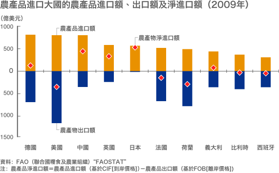 圖:農產品進口大國的農產品進口額、出口額及淨進口額(2009年)