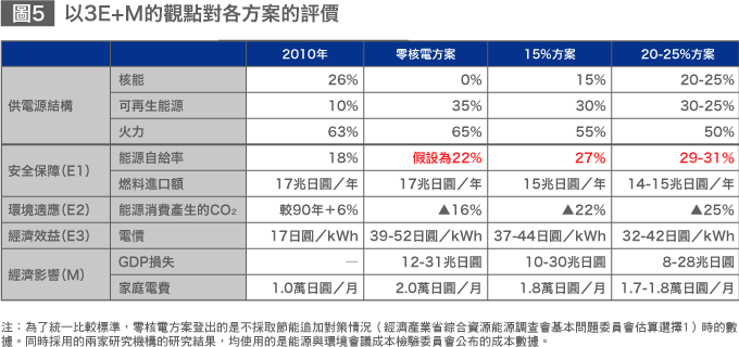 從3E+S+M的觀點來看,可再生能源、核能、火力等供電源都不可能在各個方面均得到滿分,對於日本這樣一個能源小國而言,不存在任何一種“完美的能源”。各種能源既有優點,又有缺點,最大程度地利用其優點,盡可能地迴避其缺點,實現均衡利用,這是唯一的出路。即便是選擇“零核電方案”,也需要做出這一選擇的國民對如何承受國民的負擔和經濟影響這一問題做好充分的心理準備。而如果要想降低火力發電依存度,推廣可再生能源,也需要誠摯地展示不會要求更多補貼的態度。