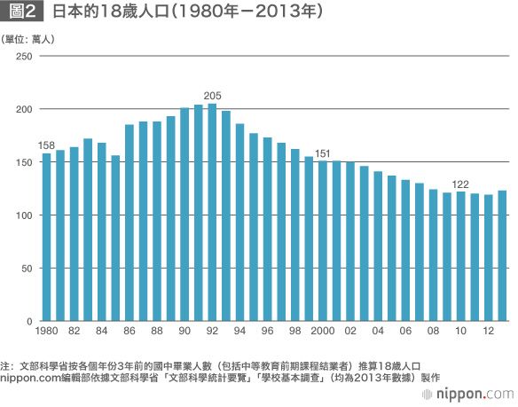 第一,是人口的變化。自20世紀80年代以來,日本的高等教育就一直面臨人口變化帶來的困境。80年代中期以前,日本的18歲人口始終維持在150萬人的水準,之後迎來一個激增時期,92年達到205萬人的峰值後,形勢急轉直下,2000年時降至151萬人,2010年時又進一步減少到了122萬人(圖2)。這種劇烈的人口變動對私立學校占比巨大的日本高等教育體系造成了巨大衝擊。在人口激增時期私立大學曾努力擴充招生能力,然而,當迎來人口劇減時,儘管升學率上升了,但從90年代後半期開始,為招不滿學生而困擾的大學相繼出現,而這樣的學校現在已多達半數以上。長期以來,日本的大學一直處於生源大大超出學校容納能力的狀態,為此,升學志願者必須參加激烈的入學考試競爭,通過嚴格的入學考試,所以,如今這種情況是大學不曾遇到過的。其結果,就迫使今天的大學不僅要改革招生及考試的方法、入學後的指導教育,還必須全面調整教育研究和管理運營的組織、財務及經營方針等。