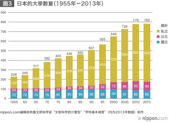 第三,政策的轉變也十分重要。1983年成立的自民黨中曾根康弘內閣,明示了新自由主義的立場,開始了以「規制(管制)改革」和「結構改革」為中心的政策轉變,而且2001年成立的小泉純一郎內閣也繼承了這一路線,為大學改革帶來巨大影響。最重要的是,在這種政策轉變中,政府開始放鬆了對大學的限制。進入90年代,首先正式著手開始的是大幅度修改《大學設置基準》這一規定了大學組織和教育基本條件的法令。對此前嚴格限制的院系教育課程設置,給予了更大的自由度。其結果,新的院系和教育課程相繼出現;大學的創辦條件也得到緩和,1990年時日本共有大學507所,2000年增加到649所,2013年擴大到782所(圖3)。