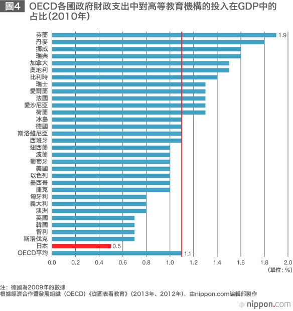 例如,擁有大量私立學校的日本,以占國內生產毛額(GDP)比例來看,政府對高等教育的支出在OECD各國中處於最低水準(圖4)。它暗示了這樣的事實:家庭支出中教育費所占比例之高、因個人負擔率高而帶來教育機會之不平等、依賴學費收入維持生存的私立大學教育研究水準之低。實際上,政府對私立大學的投入,數十年中僅停留在運營費用的10%左右;發放給國立大學的運營補助費,近10年來也削減了10%。在政府投入匱乏之中不斷發展的高等教育普及化,嚴重影響到教育研究品質,而且不得不說還潛藏著情況進一步惡化的危險性。