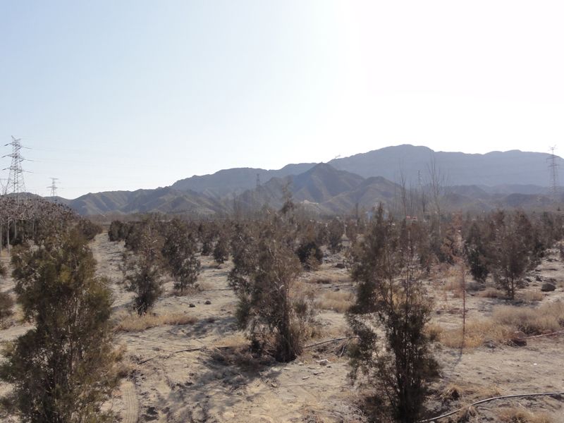 為開發煤礦而建設的位於黃河中游的烏海市近郊的人工林地。這裏的人們從黃河取水育林。雖然植樹造林減少了侵襲城鎮的沙塵,但乾燥地區寶貴的水資源也被消耗掉了(2012年3月12日,窪田攝影)