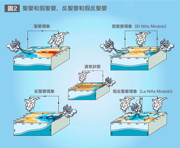「假象(Modoki)」也會引發異常氣象。2004年,出現假聖嬰現象(El Niño Modoki),國際日期變更線附近的熱帶太平洋上出現了高溫的海水團。結果,颱風的發生區域較往年東移,過去每年平均只會有3次颱風登陸日本,而當年卻多達10次。