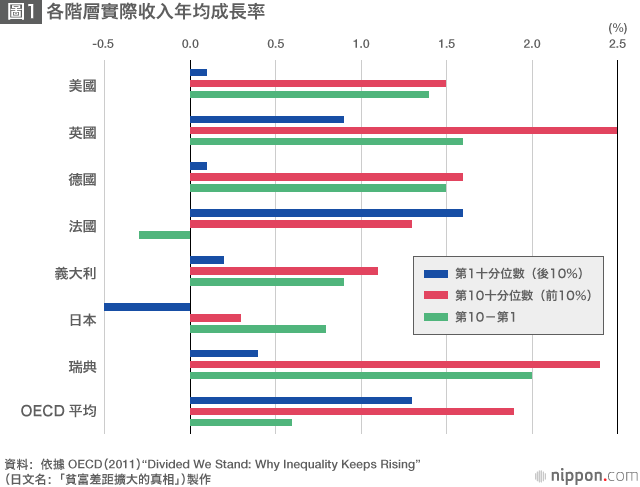在日本,本世紀頭5年推行過放寬就業限制等政策的小泉純一郎政府,以及緊隨其後的(第一次)安倍晉三內閣,都曾採用過涓滴效應(trickle-down)這種「水漲船高」政策,但它對低收入家庭產生了何種影響尚未得到充分驗證。在國際上,過去20年至30年間,對貧富差距狀況的研究已成為已開發國家的重要工作。關於這一點,2011年經濟合作暨發展組織(OECD)在一份名“Divided We Stand: Why Inequality Keeps Rising”的報告中,在對「家庭規模」和「物價水準」進行調整的基礎上,列出了上世紀80年代中期到本世紀第一個10年後期這一時間段內,各國收入排在前10%的階層與後10%的階層的實際收入變化情況(圖1)。