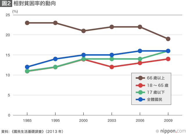但是我們可以肯定地說,按相對貧困線標準被視為貧困家庭的低收入家庭和按生活扶助標準線被視為貧困家庭的家庭,有86%存在重合關係(*2)。因此,相對貧困率的動向,就反映了與生活扶助標準以下的貧困率類似的動向。圖2展示了這種相對貧困率的趨勢,我們可以看出,總體上貧困率處於上升趨勢,尤其是年輕人的貧困率正在大幅上升。儘管也有人指出,貧困率的上升通常是由收入較少的老年人人數增多造成的,但此圖告訴我們,人口因素絕非唯一原因。