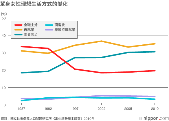 那麼,女性是否希望工作呢?國立社會保障人口問題研究所在2010年對單身男女進行的調查顯示,作為理想的生活方式,女性選擇最多的是「再就業」,即結婚生子時暫時辭職,養兒育女告一段落之後再出去工作,占了整體的35%(小數點以下四捨五入)。其次選擇較多的是,結婚或者生孩子之後仍然繼續工作的「兩者同步」,31%的女性認為這是理想的生活方式。再次,是選擇結婚或生孩子之後辭去工作,其後也不再工作的「全職主婦」方式,20%的單身女性追求這樣的生活方式。以不結婚一直工作的「非婚持續就業」(5%)及結婚但不要孩子的「頂客族」(3%)為理想的女性占少數(國立社會保障人口問題研究所《第14次出生趨勢基本調查(關於結婚與生育的全國調查)》2010年)。