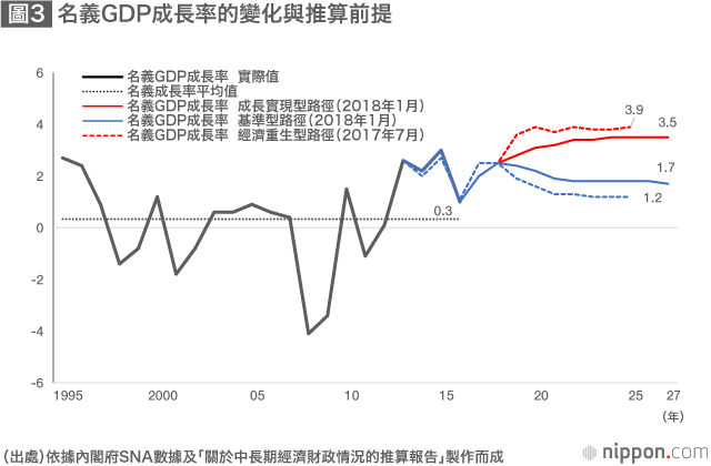 當然,或許也有人會認為上一次中長期推算報告用作前提的名義成長率(1.25%)也太高了。因為1995年到2016年這段時期,名義GDP成長率的平均值僅有0.3%,而上一次報告的基準型路徑卻設定了1.2%的前提。