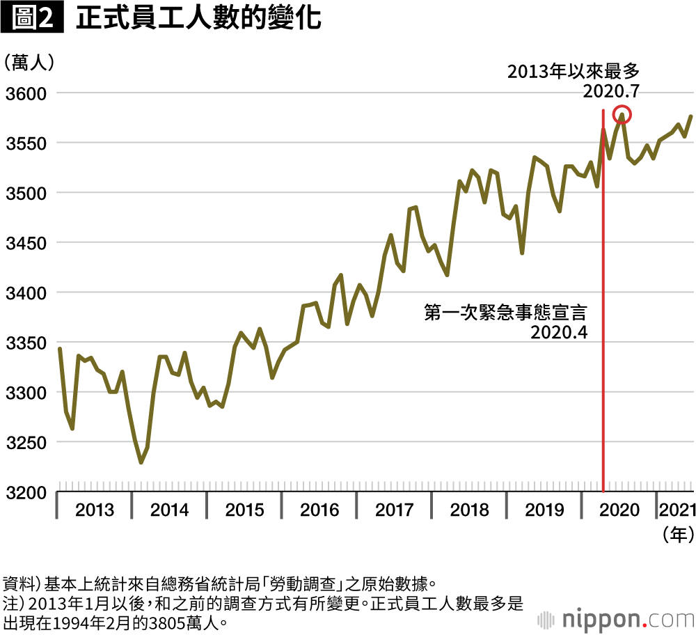 與此同時,令人意外的是,正式員工人數則在發佈緊急事態宣言的2020年4月創下了自2013年以來的最高紀錄(圖2)。緊急事態宣言解除後的2020年7月,正式員工人數仍進一步成長。8月以後,正式員工人數的成長雖然暫時停滯,但從疫情前就顯露出來的成長趨勢仍在持續。最終,日本的正式員工人數,自2002年經濟嚴重不景氣以來首次重返3500萬人大關。