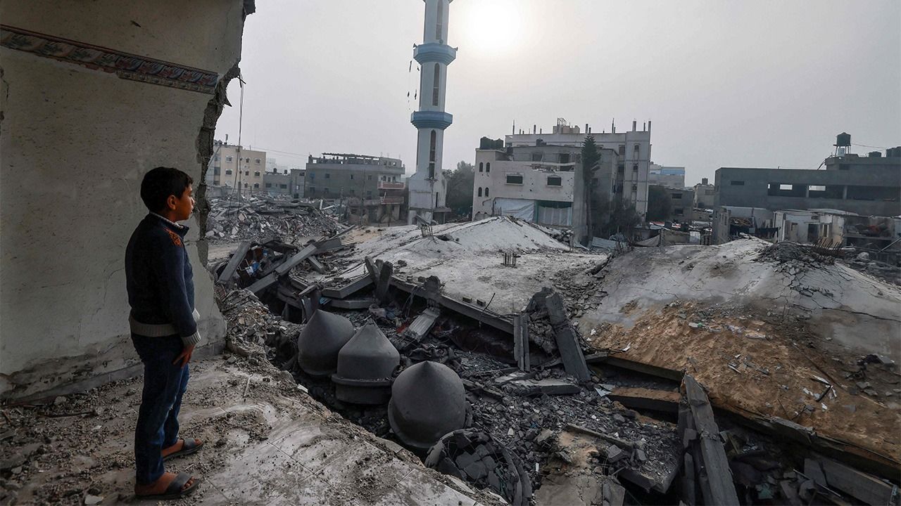 標題圖片:2024年2月25日,巴勒斯坦自治區加薩南部拉法,兒童凝視著被以色列軍隊攻擊摧毀的清真寺(伊斯蘭禮拜所) (AFP/時事)