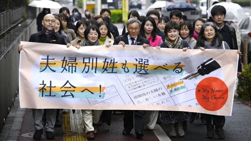 標題圖片:為爭取夫婦別姓而提起集體訴訟的多名原告走向東京地方法院,2024年3月8日(共同)