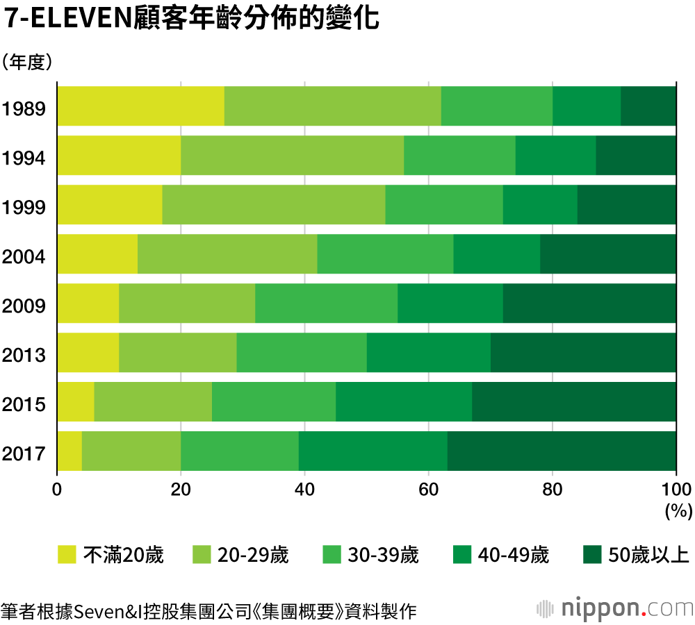 要說其中的原因,那就是光顧超商的消費者正趨向老齡化。觀察7-ELEVEN的客流情況可以發現,1989年時不滿20歲的年輕人占到了62%,但2017年時已經降至20%。而50歲以上顧客群體從9%升至37%,成長了3倍。由於老年人很少深夜購物,所以隨著老齡化社會的發展,對24小時營業有需求的消費者呈現出減少趨勢。