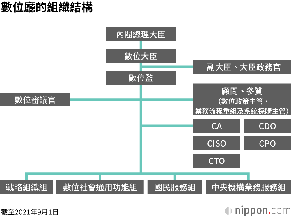 數位廳的長官,即主管大臣由內閣總理大臣親自擔任,下設統管各項事務的數位大臣。除了副大臣和大臣政務官外,還設有主持具體工作的「數位監」和「數位審議官」等職務。數位廳成立時,職員人數就達600人規模,其中約200人為民間人士(含外聘人員)。