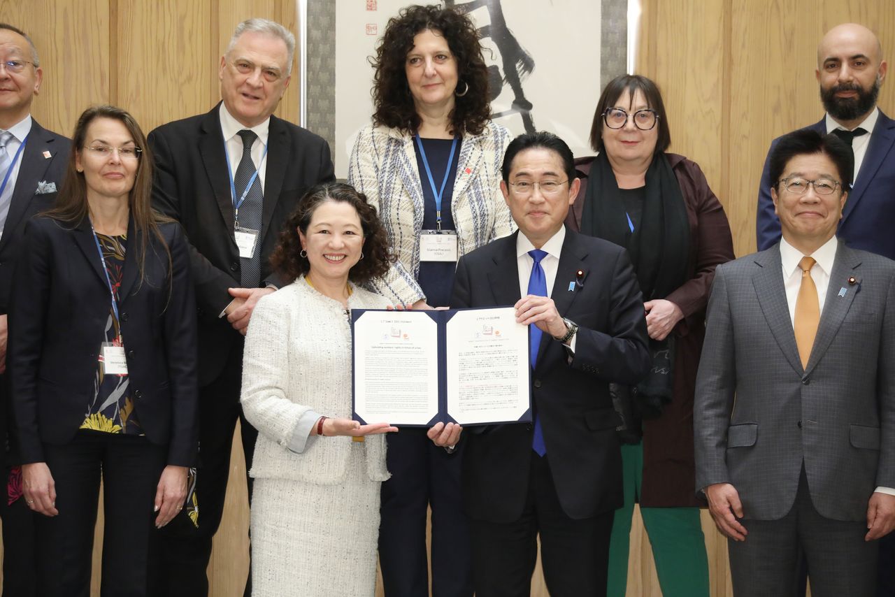 岸田文雄首相(中央右)收下總聯合會會長芳野友子(中央左)遞交的「L7峰會2023」聲明,2023年4月7日,首相官邸(時事)