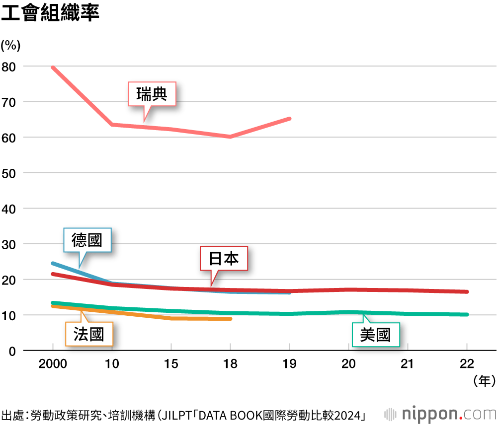 下圖展示了主要國家的工會組織率。各國均呈現下降趨勢(韓國例外,近年來組織率上升,2021年達到14.2%)。從最近的數字來看,以瑞典為代表的北歐地區較高,而德國、日本和美國只略高於10%,法國甚至不到10%。
