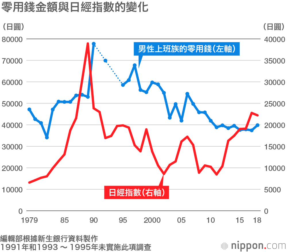 新生銀行實施的「上班族零用錢調查」結果顯示,2018年男性上班族的零用錢比上年增加2408日圓,達到3萬9836日圓。這是自2015年以來連續三年超過3萬7000日圓,基本與2014年相同。然而,較之日經指數因2011年後的「異次元」量化寬鬆政策而迅速攀升,上班族的零用錢卻「不為所動」,幾乎沒有明顯增加傾向。