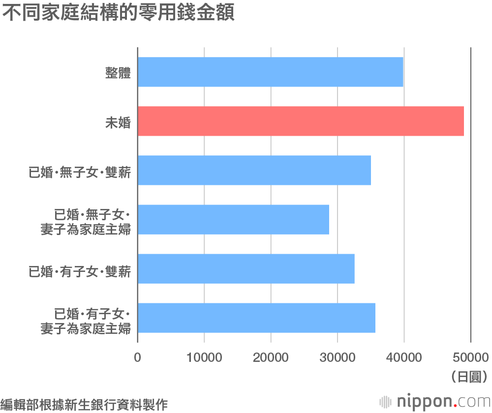 新生銀行實施的相關調查結果顯示,2018年日本上班族的零用錢比上年增加2,408日圓,達到3萬9836日圓。家有子女者的零用錢通常比單身人士更少,可以認為是子女教育費用負擔造成的影響。