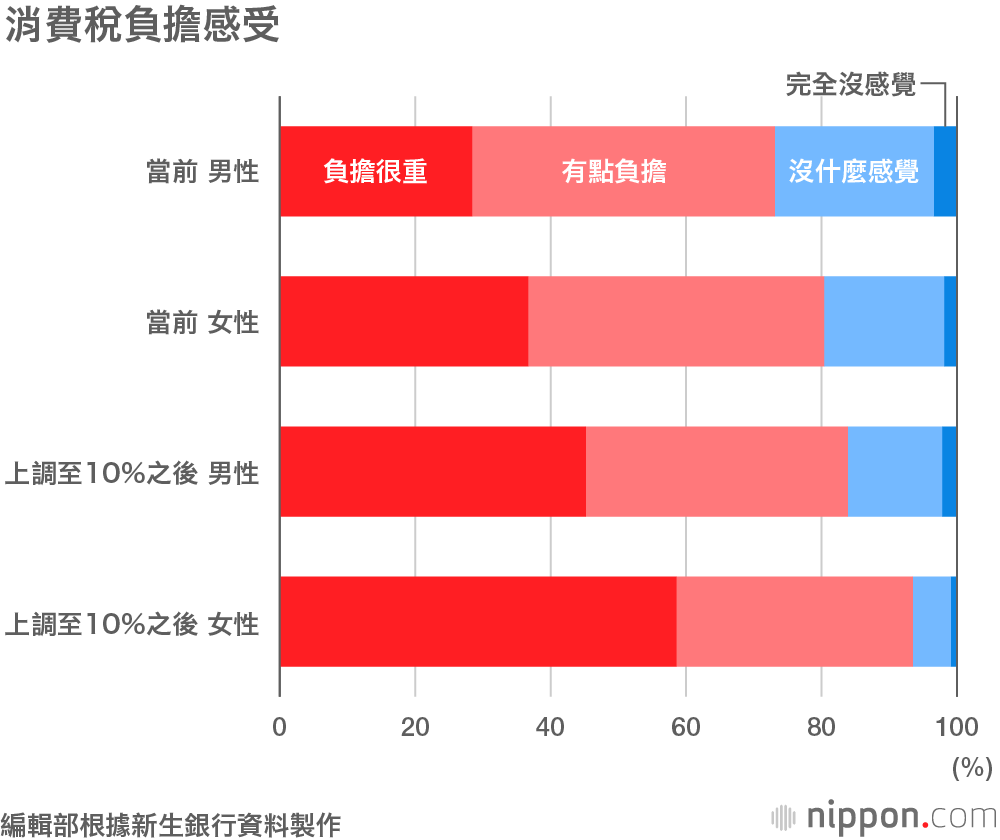 關於消費稅對家庭收支的壓迫感問題,如果2019年10月消費稅上調至10%,有83.9%的男性感到負擔加重(包括「負擔很重」和「有點負擔」),比當前的73.1%高出了10.8個百分點。而有93.6%的女性感到負擔增加,比當前的80.4%增加了13.2個百分點。可以看出,女性更加擔憂消費稅增稅帶來的影響。
