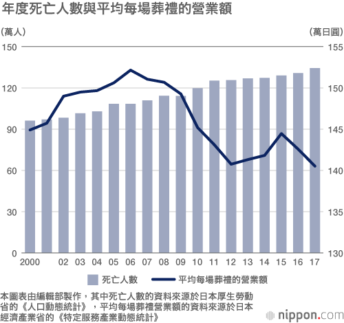 隨著老齡化的發展,日本正急速進入死亡人數不斷攀升的「多死社會」。日本2017年的死亡人數為134萬人,與2000年的96萬人相比,17年間成長了4成。死亡人數的上升,必然導致葬禮的增加,但是隨著少子化和未婚率的上升,葬禮方式也在發生變化。
