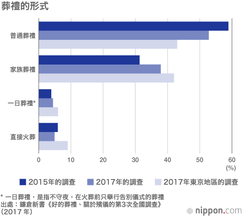 鐮倉新書公司(東京總部)運營一個與葬禮、殯葬相關的資訊綜合網站。根據該公司2017年實施的一項全國調查,「普通葬禮」的比例占52.8%,較2015年的前一次調查下降了6.1%,「家族葬禮」的比例則成長了6.6%,達到37.9%。該公司指出,「花費低、參加人數少、耗時短的葬禮正增加,但另一方面,『普通葬禮』的比例仍占半數以上,擁有不容動搖的支持率」。與前一次調查相比,「直接火葬」的情況略有減少,從中可見「即便參與送殯的人數有所減少,但舉行弔唁儀式的文化仍得以維持」。