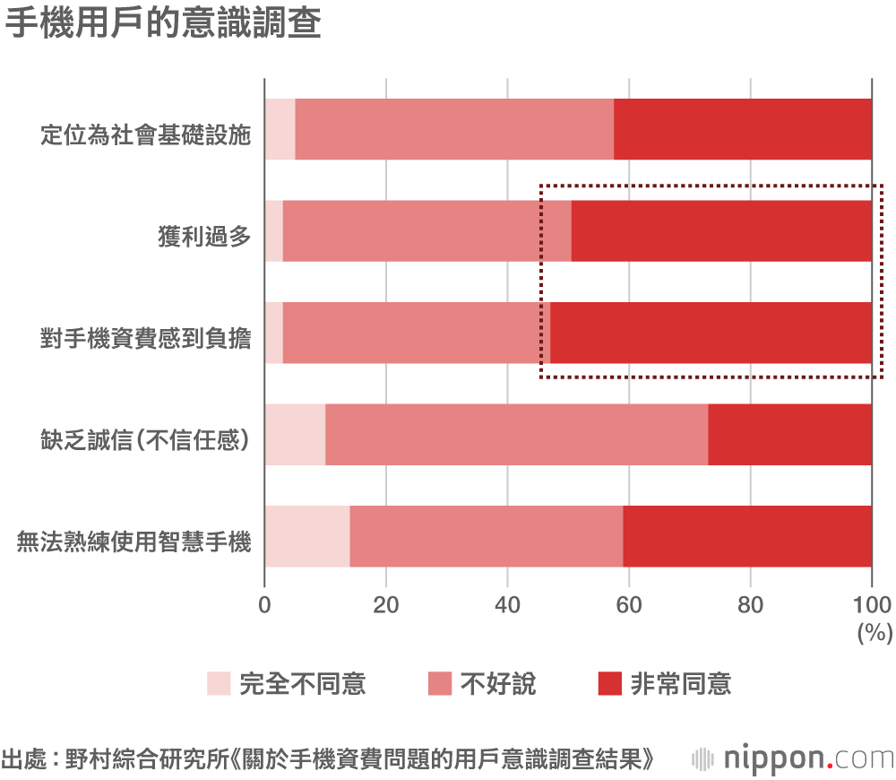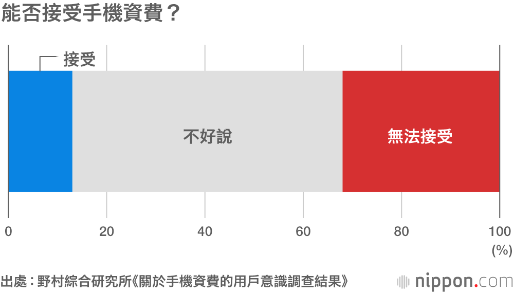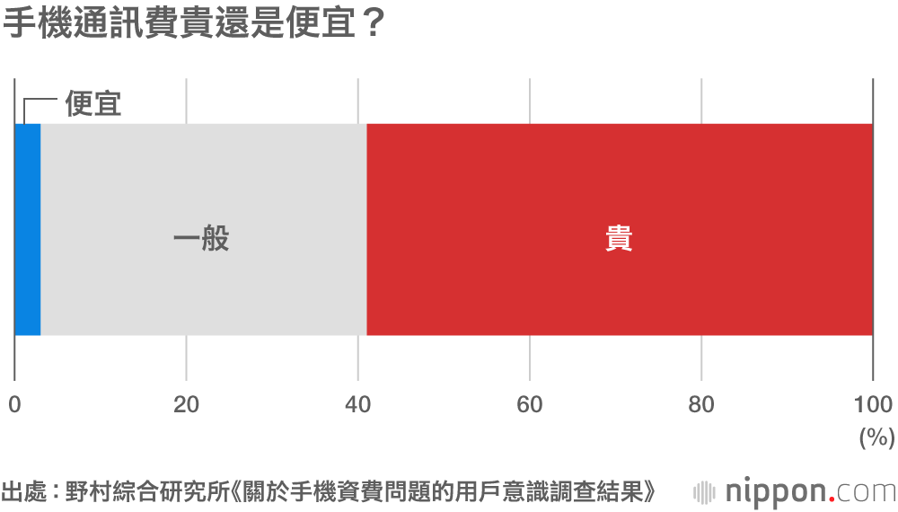 以日本全國的3000名手機使用者為對象,日本野村綜合研究所實施了一項關於手機通訊費的調查。結果表明,約60%的人感到手機資費「太貴」,約30%的人感到「無法接受」。該調查於2018年7月通過網路實施,對象是與日本三大移動運營商(NTTDocomo、SoftBank、au)任意一家簽約且自費繳費的用戶。