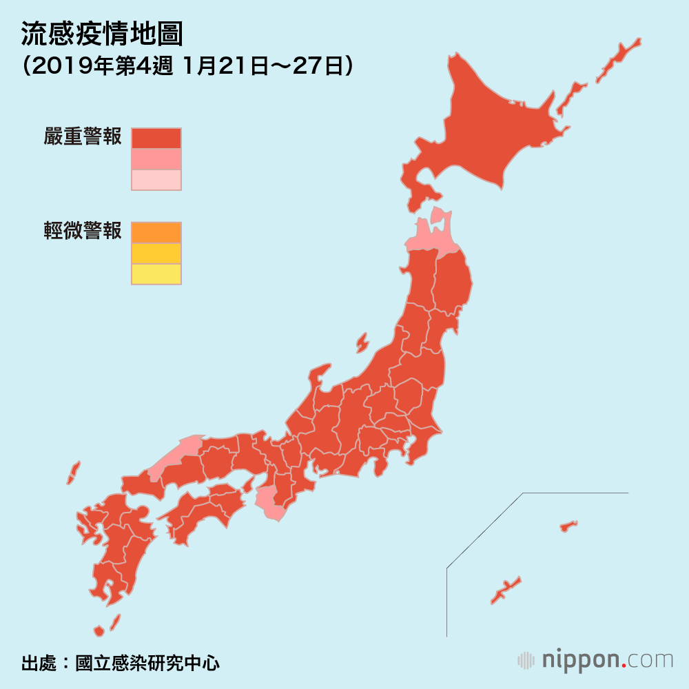 日本全國流感肆虐,已達發佈警報界線:至1月第4週為止流感感染人數估計達222萬6000名