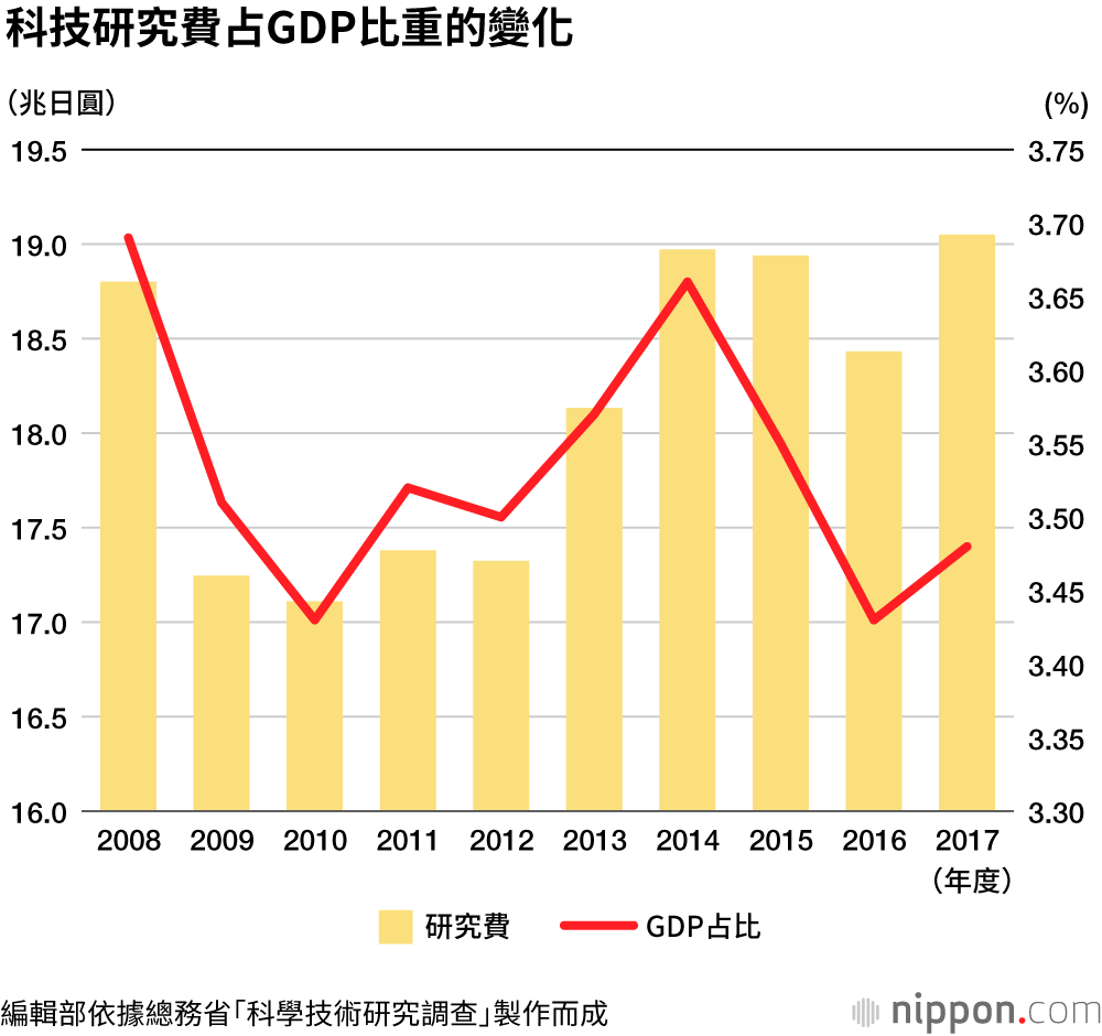 2017年度(財年,2017年4月~2018年3月)的科技研究費刷新了歷史最高紀錄。但總金額卻不到中國的一半。