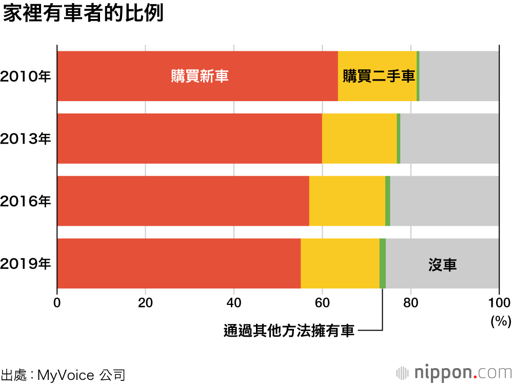 無車家庭在2010年首次調查中占18.1%,此後該比例逐次提高。「購買二手車」的比例幾乎沒有變化,回答「購買了新車」的人則在減少。