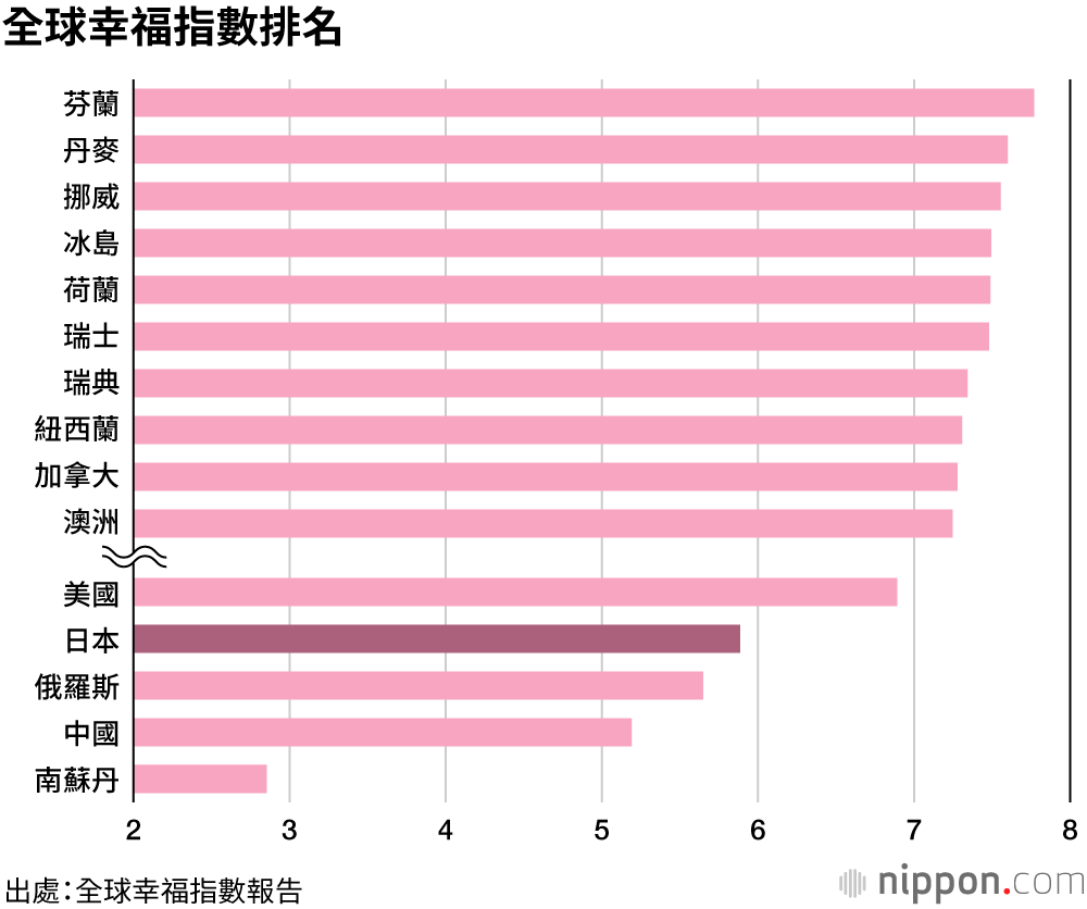 日本人雖然長壽,但是缺乏自由和社會包容性,幸福指數在全球排名第58位,在G8國家中倒數第二,僅高於俄羅斯。