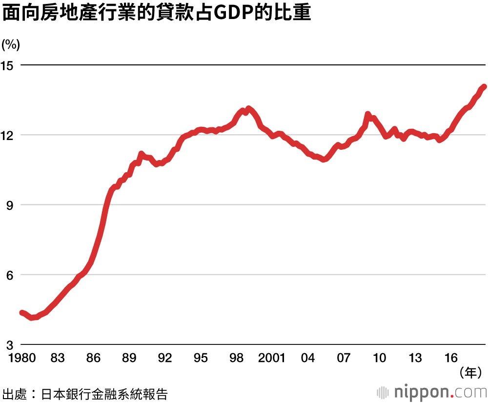 日本銀行發佈的金融系統報告分析稱,2018年底面向房地產行業的貸款占GDP的比例之高,已呈現出1990年底以來久違的「過熱」狀態。雖然新增貸款額近一兩年有所減少,但貸款餘額仍繼續成長,占GDP的比例也達到14.1%,刷新歷史新高。