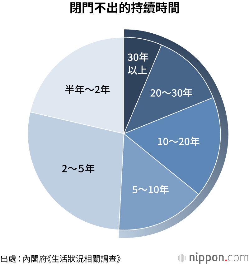 此次調查還發現,逾半數家裡蹲與世隔絕狀態超過5年。其中,超過30年的為6.4%,20~30年的為12.7%。一些人在20~39歲之間成為家裡蹲,之後一直沒有出現擺脫這種生活狀態的契機,於是不斷走向長期化進而邁入老年。