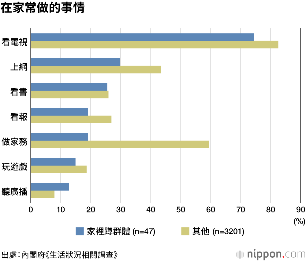 針對「在家中常做的事情」這一問題,回答「看電視」「上網」「玩遊戲」等的家裡蹲比例則低於普通人,由此可見,他們並非一般人想像的那樣,是因為沉溺於虛擬世界而居家不出,主要還是由於他們總體上不那麼積極活躍。