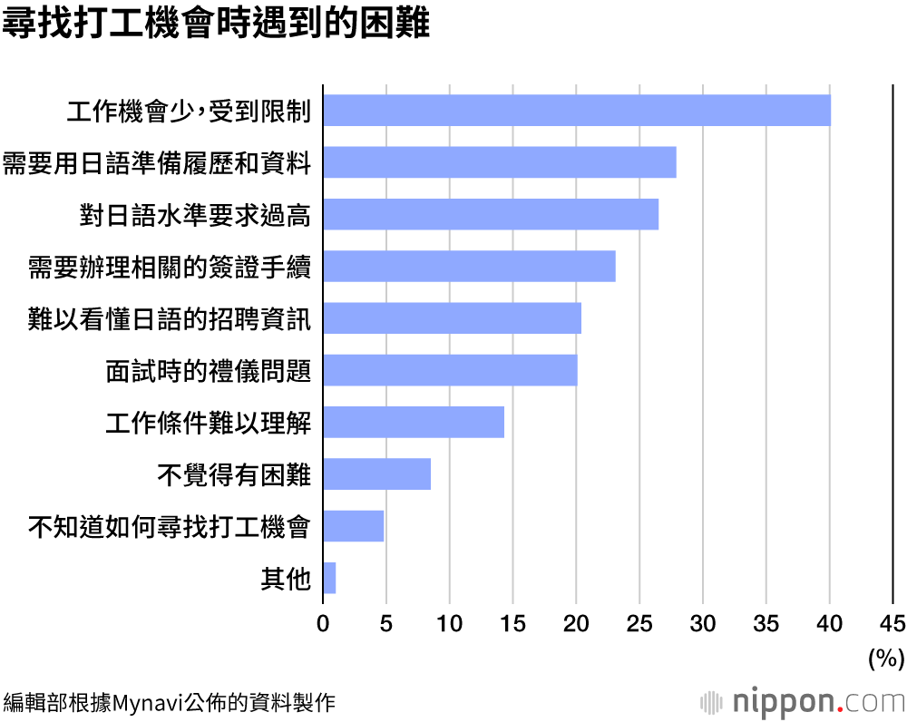 招聘網站巨頭Mynavi的調查顯示,在日本有打工經驗的外國人中,約四成人感到「外國人的工作機會少或各種限制多」。此外,關於「尋找打工機會時所遇到的困難」,回答人數最多的依次是「需要用日語準備履歷和資料」「對日語水準要求過高」「難以看懂日語的招聘資訊」等,可見他們在尋找打工機會時遇到的難題與日本人不同。