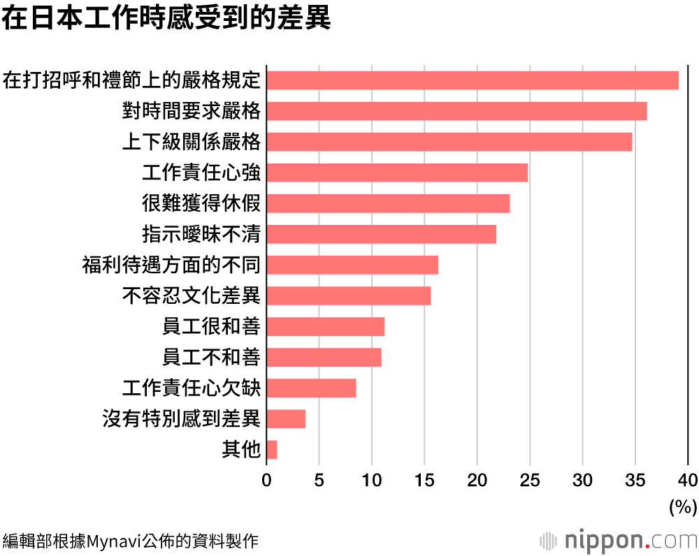被問及「在日本工作與自己國家有何差異」時,回答最多的依次是「對打招呼和禮節要求嚴格」「強調守時」「上下級關係嚴格」,從中可以看出他們對日本人的「嚴格」倍感困惑的現狀。此外,還有人指出「很難獲得休假」「指示曖昧不清」等。
