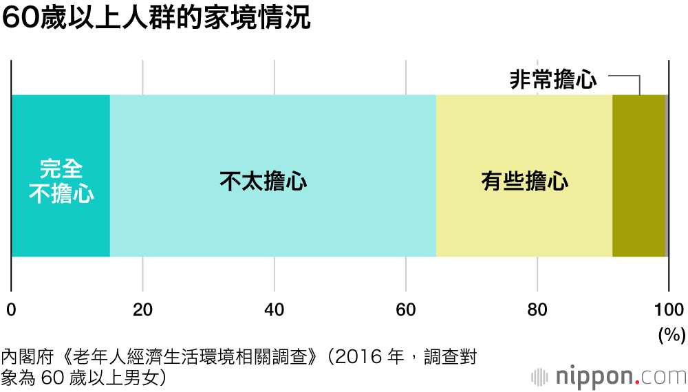 在內閣府面向60歲以上人群實施的調查中,關於家境情況的問題,回答「生活費充裕,完全不擔心」「談不上充裕,但也不太擔心」的受訪者比例合計達到了64.6%。年齡越大,回答「不擔心」的比例就越高,80歲以上人群的該比例達到了71.5%。