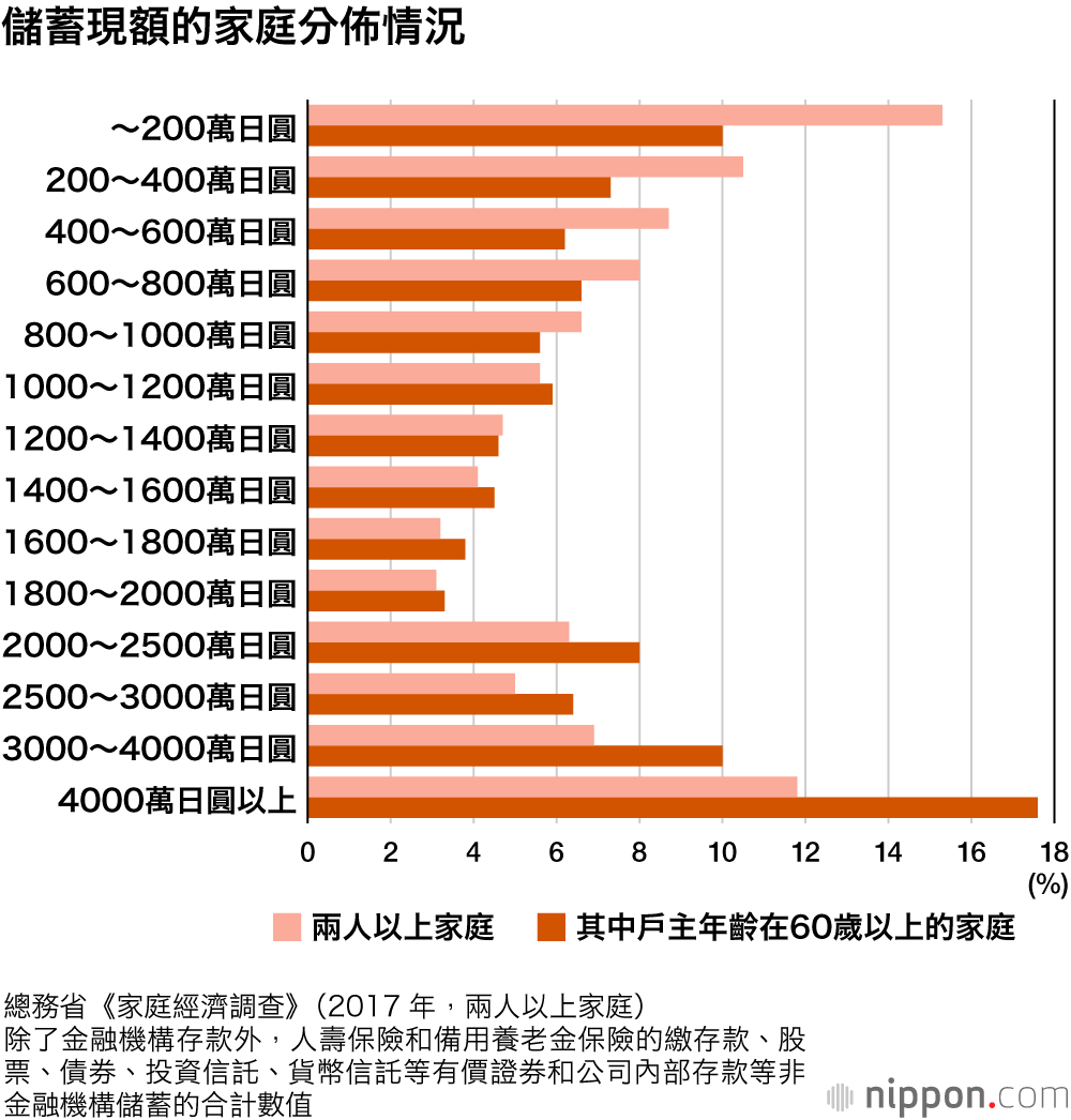 儲蓄額方面,家庭成員在兩人以上的「全部家庭」的中值為1074萬日圓,而「戶主年齡在60歲以上」的家庭為1639萬日圓,大約為1.5倍。同時,從儲蓄現額階梯分佈情況來看,「戶主年齡在60歲以上」的家庭中,4000萬日圓以上的家庭占17.6%,與「全部家庭」(11.8%)相比,可謂是一個相當高的比例。