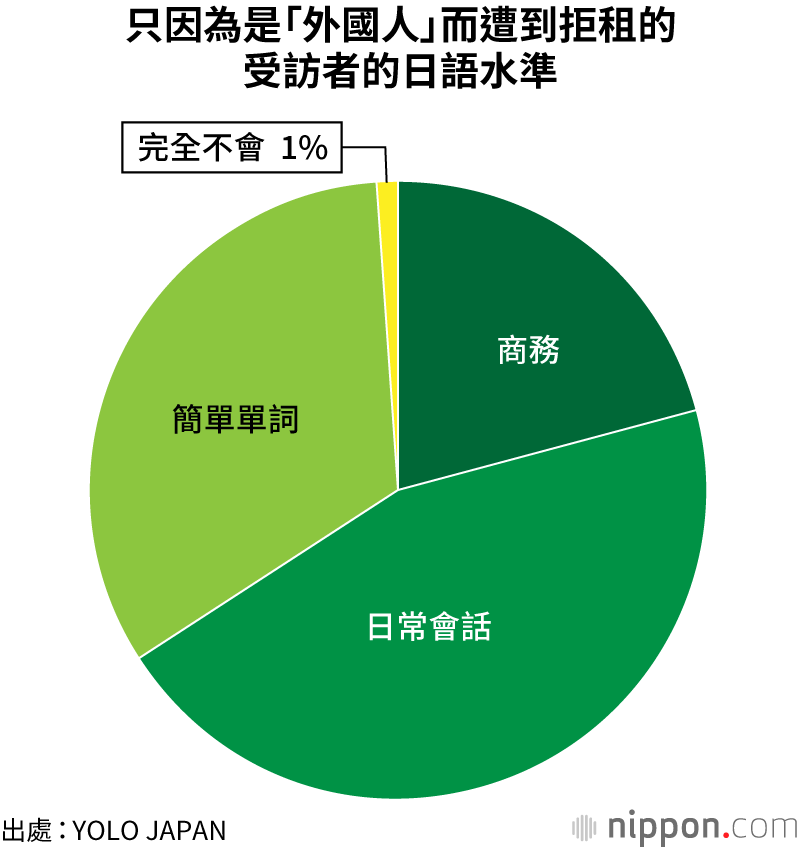 遭到拒租的人,其日語語言能力有45% 為「日常會話水準」,22%達到了「商務交流水準」,即接近70%的人具備了一定程度以上的會話能力,回答「不會說日語」的受訪者僅占1%。