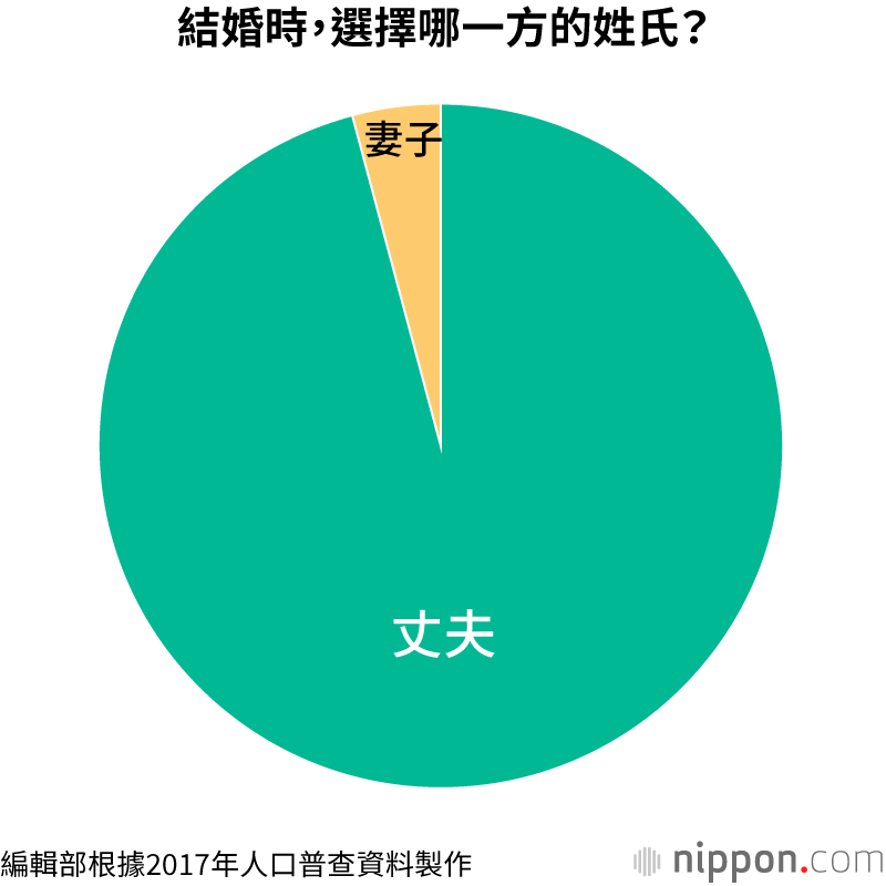 雖然《民法》條文規定「要稱夫姓或妻姓」,但2017年的人口普查顯示,60萬6866對夫妻中只有2萬5049對選擇妻姓,占整體的4.1%。對於絕大多數女性而言,結婚便意味著要改姓。
