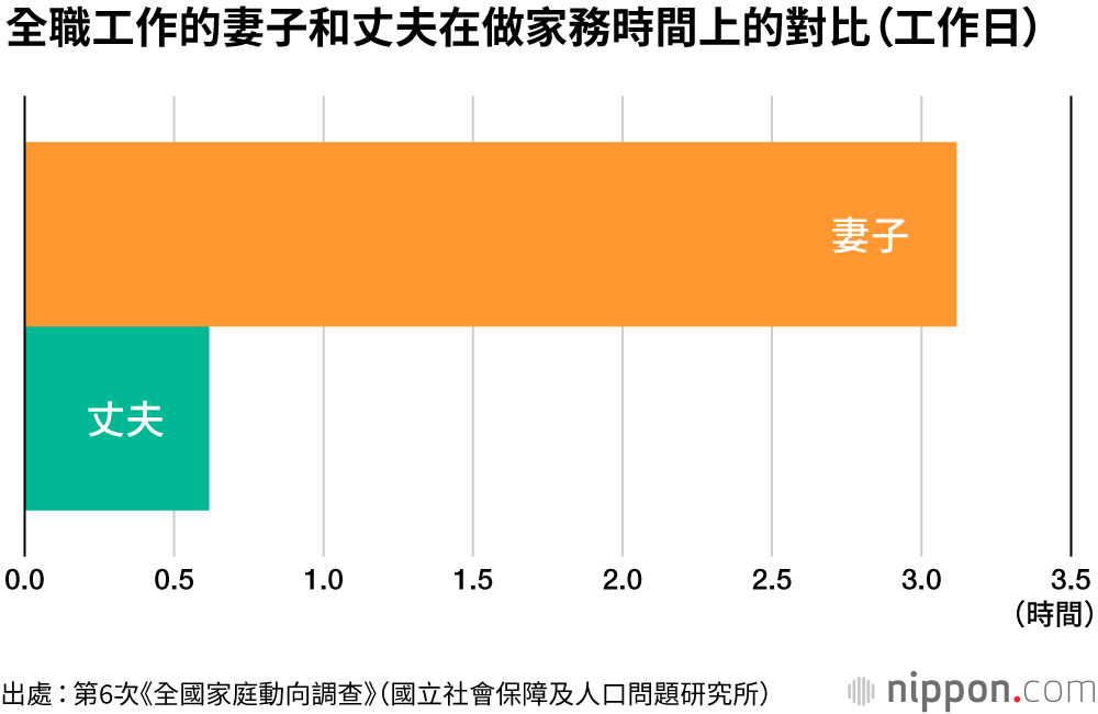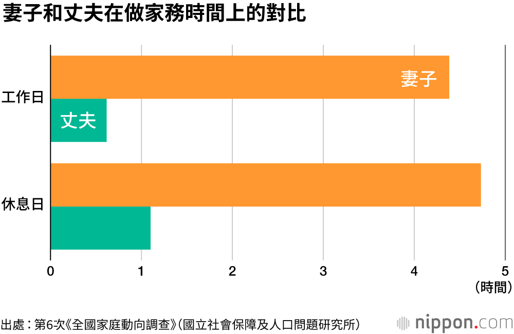 關於花費在做飯和打掃等家務上的時間,工作日時,丈夫為37分鐘,妻子為4小時23分鐘,是丈夫的7倍;即使是在休息日,相對丈夫的1小時6分鐘,妻子為4小時44分鐘,約是丈夫的4倍。