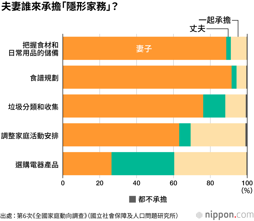 「把握食材和日常用品的儲備」、「食譜規劃」的約9成是妻子。雖然在出門上班時順便倒垃圾是很多丈夫擅長的一項家務,但在這之前很重要的一步,也就是紙張、塑膠、寶特瓶等麻煩的垃圾分類工作,卻大多是由妻子來完成。丈夫們唯一大顯身手的,是在選購電器產品的時候。