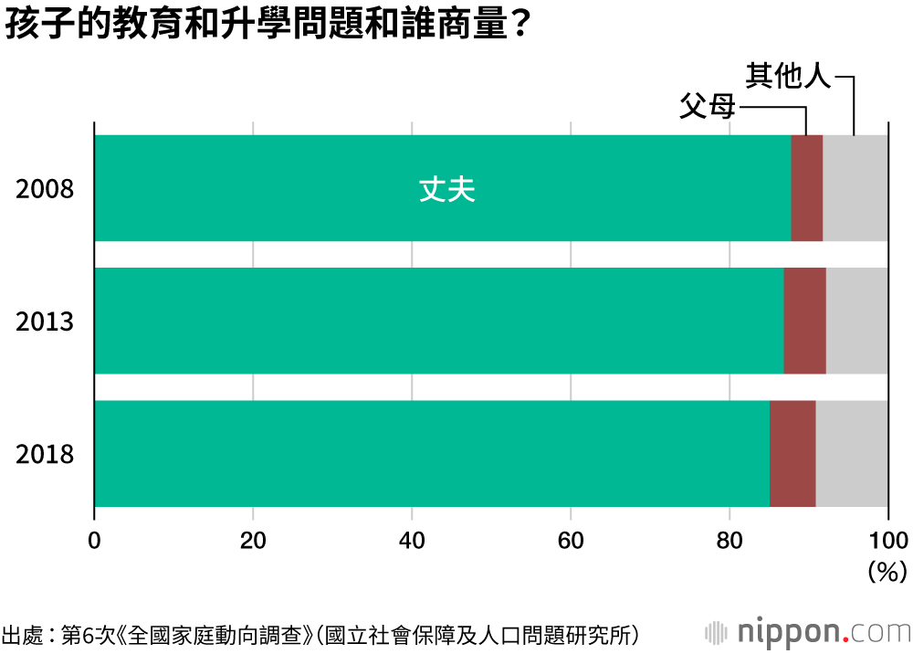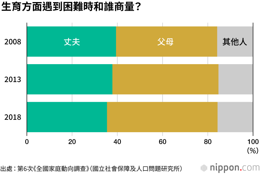 關於妻子的精神依靠,在被問及「生兒育女中遇到的困難和誰商量」時,回答父母的多於丈夫。而且,隨著進一步的調查可以發現,丈夫的存在感變得愈加薄弱。雖然「孩子的教育和升學問題」到底還是得與丈夫商量,但這個比例也在緩慢下降。