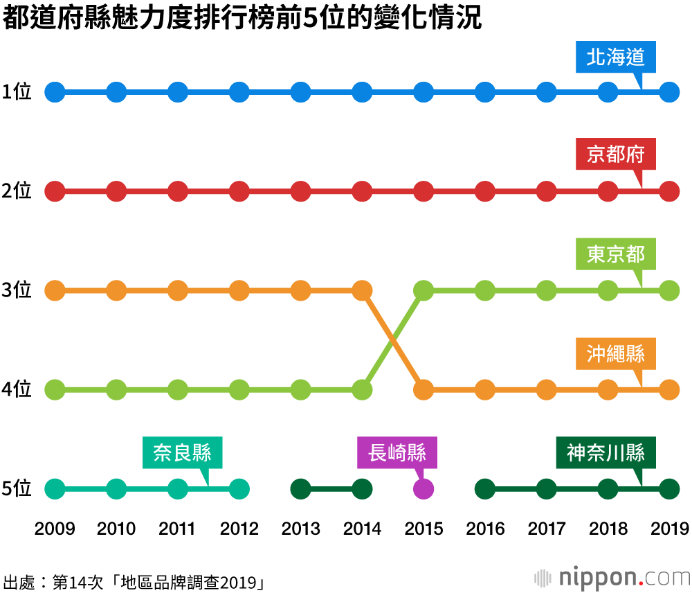 民間調查公司品牌綜合研究所發佈的「地區品牌調查2019」顯示,北海道位元列日本全國都道府縣魅力度排行榜第1名。自2009年開始這項調查以來,北海道已連續11年蟬聯榜首,而且在「旅遊意願度」和「(地方特產的)食品回憶率」分項上也名列第1。魅力度排行榜第2到第5位分別是京都、東京、沖繩和神奈川,前5名的順序連續4年保持不變。