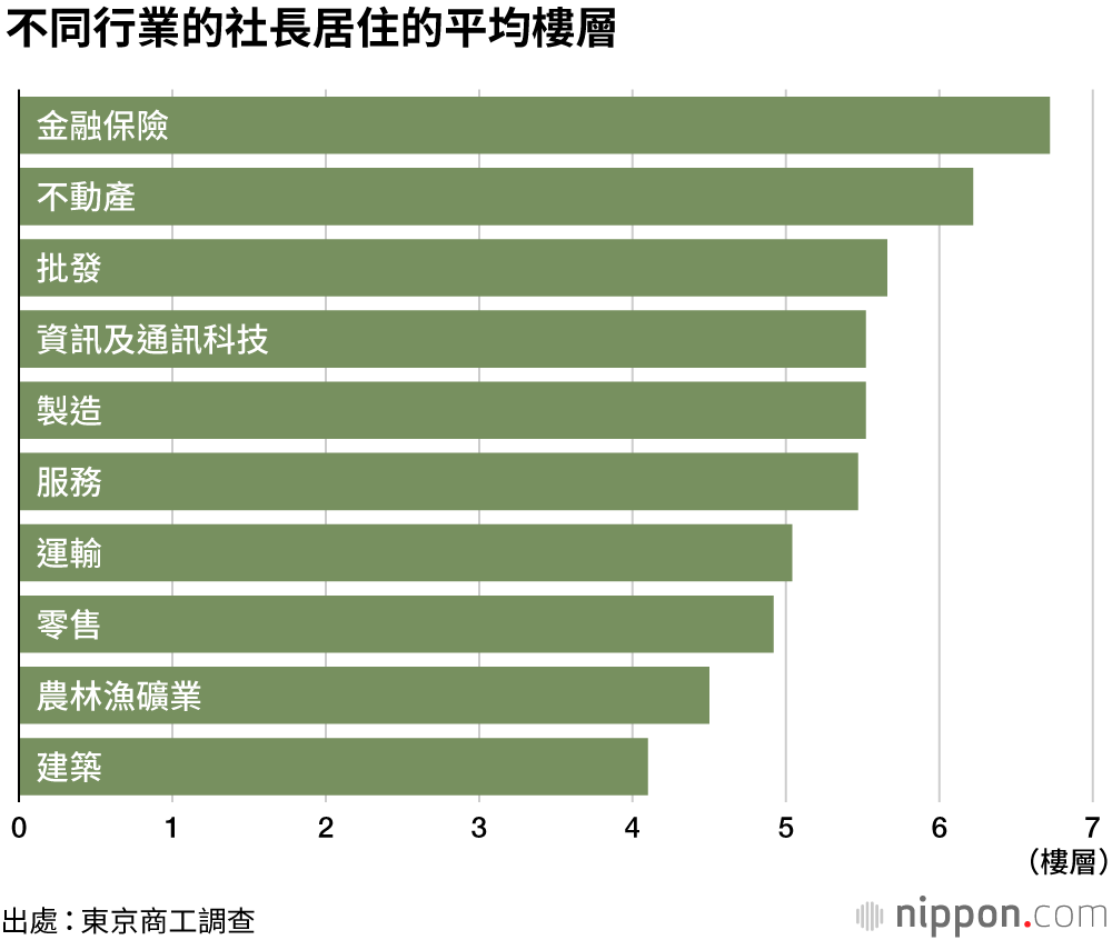 從公司銷售額來看,未達10億日圓的公司老闆居住的樓層平均為5.56樓,而超過10億日圓的老闆們居住的樓層平均在8樓以上。從不同行業來看,金融保險業的總裁住的樓層最高,平均為6.72樓。因為公司多集中於東京和大阪等都市地區,所以住在高樓層公寓的社長也較多。