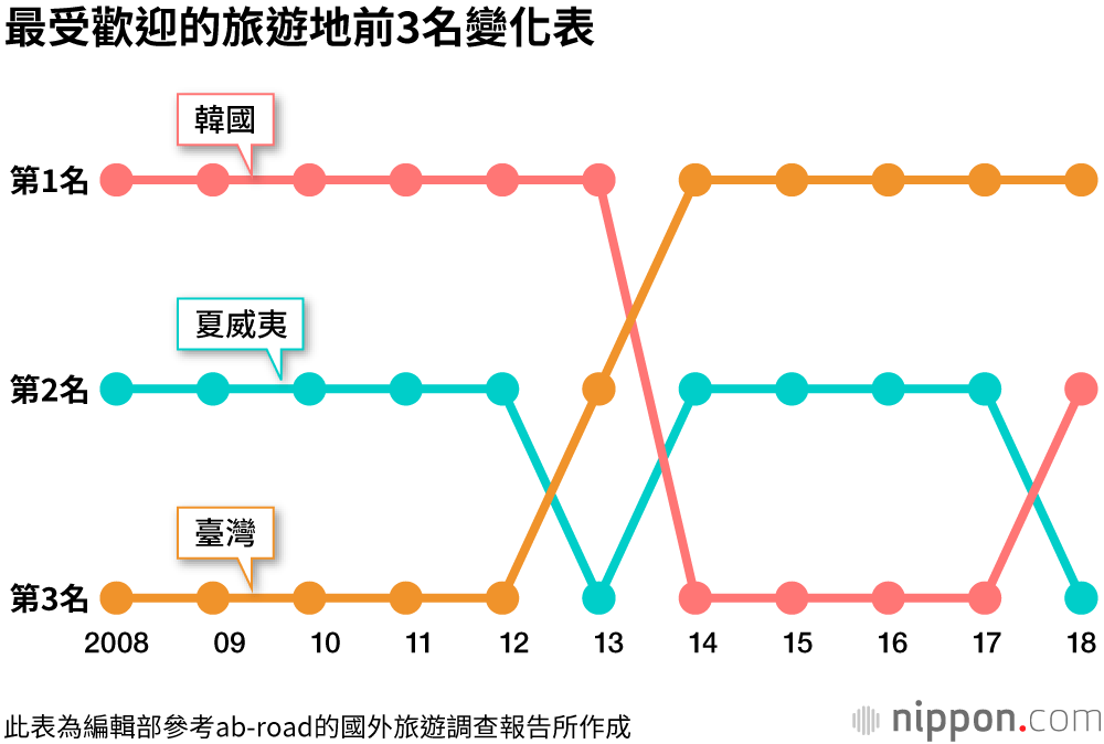 2018年度最多日本人去旅遊地是臺灣。第2名是韓國、第3名是夏威夷。這3個國家及區域,從10年前開始就一直是擁有超高人氣的旅遊勝地。